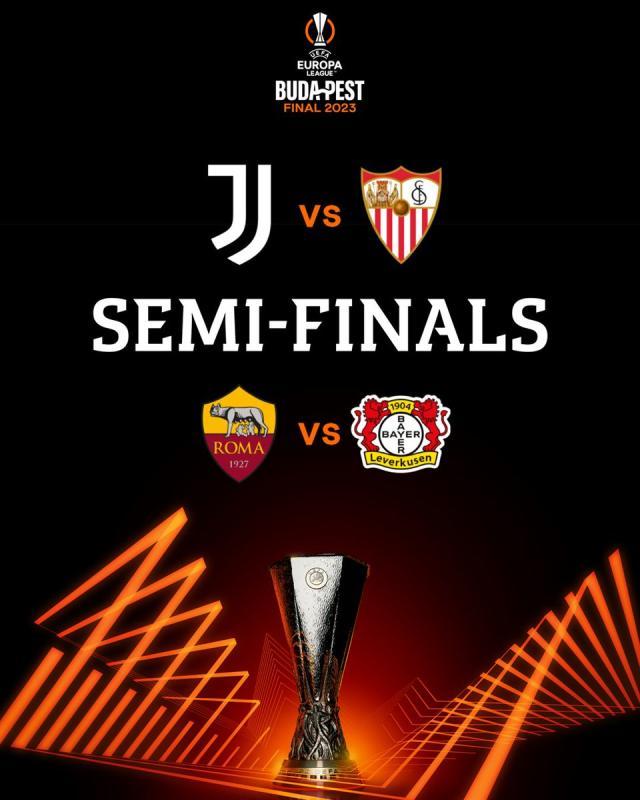 半决赛对阵为:尤文图斯vs塞维利亚(列前的先主后客),罗马vs勒沃库森,两回合分别在5月10日和5月17日进行。