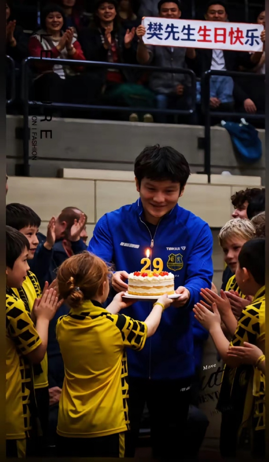 网友晒出视频,在前几日的德甲赛场,球迷在赛后提前为樊振东29岁生日庆生。