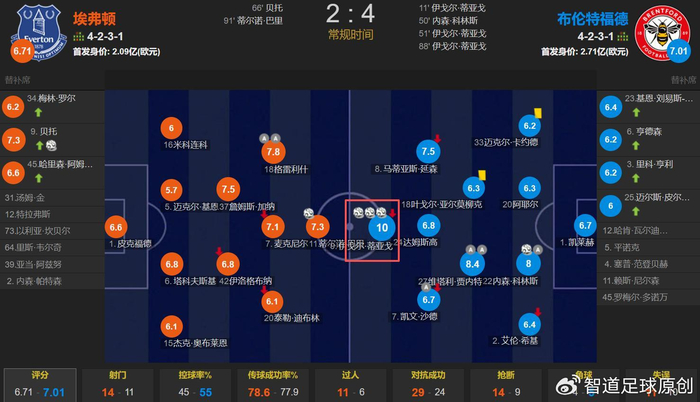 英超第20轮,埃弗顿2-4布伦特福德,伊戈尔-蒂亚戈首发出战,上演帽子戏法,赛后获得全场最高的10.0分(满分)。