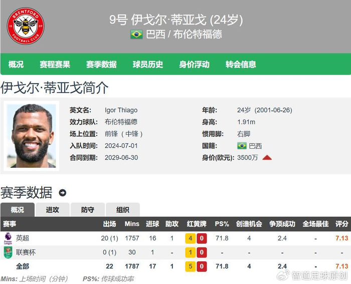 伊戈尔-蒂亚戈现年24岁,球员最好的年纪,身高1.91米,右脚中锋,德转估价3500万欧元,相信下一次更新就会暴涨了。伊戈尔-蒂亚戈出战了本赛季全部的21轮英超,其中20次首发,16球1助,这不比阿森纳中锋约克雷斯、曼联中锋舍什科之辈强太多吗?